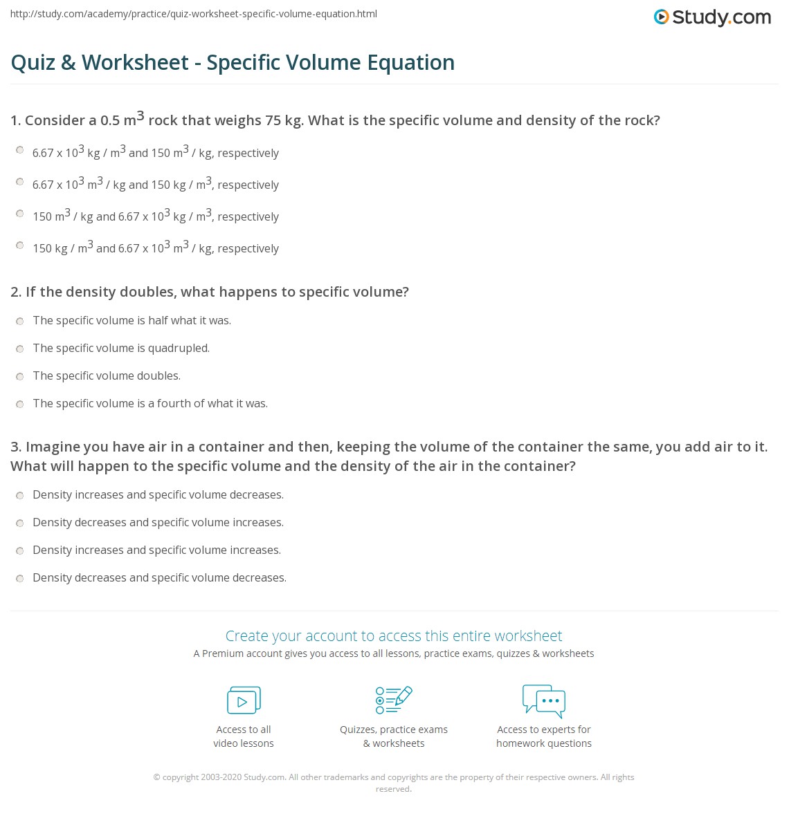 Its mass is 26.76 g and its volume is 3 cm. D = m / v solution: Density is equal to mass divided by volume (d = m / v), so if you know the mass and volume of an object, you can calculate density. You think you have found a diamond. The mercury used to fill the cylinder weighs 306.0 g. The density then is the mass divided by the volume: Density practice problem worksheet 1) a block of aluminum occupies a volume of 15.0 ml and weighs 40.5 g. 17.09.2021 · to determine the density you need the volume and the mass since. The mercury used to fill the cylinder weighs 306.0 g. D = m / v solution: Density is equal to mass divided by volume (d = m / v), so if you know the mass and volume of an object, you can calculate density. Density is the measurement of the compactness of an object. This physical property is often used to identify and classify substances. Mass is how much matter is inside of an object. 2) mercury metal is poured into a graduated cylinder that holds exactly 22.5 ml. Sometimes, you'll be given this information outright, but other. The volume of the cube is 2cm x 2cm x 2cm = 8cm 3. Volume is how much space. Density, mass and volume and prepare them to complete a performance task in which they must use their knowledge of these concepts. It is usually expressed in grams per cubic centimeters, or g/cm3. Mass = 35 grams unknown: Mass is how much matter is inside of an object. Thus the cube is not gold, since the density (5.0 g/cm 3) is not the same … Volume is how much space. Density is a measure of the amount of mass in a certain volume. Worksheet #1 calculate density, and identify substances using a density chart. Welcome to the virtual density testing lab! The density then is the mass divided by the volume: Volume and surface area help us measure the size of 3d objects. You know the mass (40 g), but the volume is not given. D = 35g/7 cm3 d = 5 g/cm3 D = \dfrac{m}{v} where d is density, v is volume, and m is mass.this can be rearranged in order to find volume or mass depending on which quantities you are given and what the question asks you to find. Density practice problem worksheet 1) a block of aluminum occupies a volume of 15.0 ml and weighs 40.5 g. The volume of the cube is 2cm x 2cm x 2cm = 8cm 3. It is usually expressed in grams per cubic centimeters, or g/cm3. Mass = 35 grams unknown: Thus the cube is not gold, since the density (5.0 g/cm 3) is not the same … The density then is the mass divided by the volume: Solids density g/cm3 solids density g/cm3 marble 2.56 copper 8.92 quartz 2.64 gold 19.32 diamond 3.52 platinum 21.4 while digging in the backyard, you find an old coin. Volume = length x width x height. Mass is how much matter is inside of an object. 2) mercury metal is poured into a graduated cylinder that holds exactly 22.5 ml. Density, mass and volume and prepare them to complete a performance task in which they must use their knowledge of these concepts. Volume is how much space. From there, we'll tackle trickier objects, such as cones and spheres. Density = mass ÷ volume to find density: Density, mass and volume are all related by the formula,. Density (g/ cm3) volume = 7 cm3 formula: You know the mass (40 g), but the volume is not given. What is the coin made of? This physical property is often used to identify and classify substances. D = \dfrac{m}{v} where d is density, v is volume, and m is mass.this can be rearranged in order to find volume or mass depending on which quantities you are given and what the question asks you to find. If the mass of an object is 35 grams and it takes up 7 cm3 of space, calculate the density set up your density problems like this: 17.09.2021 · to determine the density you need the volume and the mass since. Volume And Density Worksheet - Mass Volume And Density Without Josephs 2012 Mass Volume And Density Without Numbers Acirc Euro Ldquo Answer Key We Have Recently Talked About The Relationship Between Mass Volume /. 17.09.2021 · to determine the density you need the volume and the mass since. This physical property is often used to identify and classify substances. D = 35g/7 cm3 d = 5 g/cm3 2) find the volume of the object 3) divide : Its mass is 26.76 g and its volume is 3 cm.